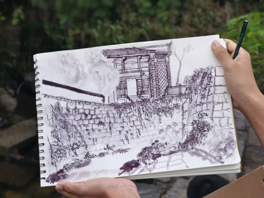 杜杰老师也不作过多讲解,让孩子们以小组为单位,自由分布在村落的不同角落,用钢笔、墨水、毛笔描绘出自己在查济的所观所感。
