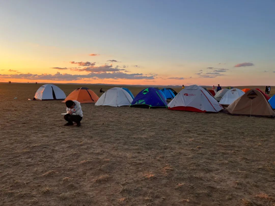 黄昏的草原,和丁老师坐在帐篷旁饮酒。孩子们在四周自由玩耍,有一群孩子围着冯刚老师讨教。