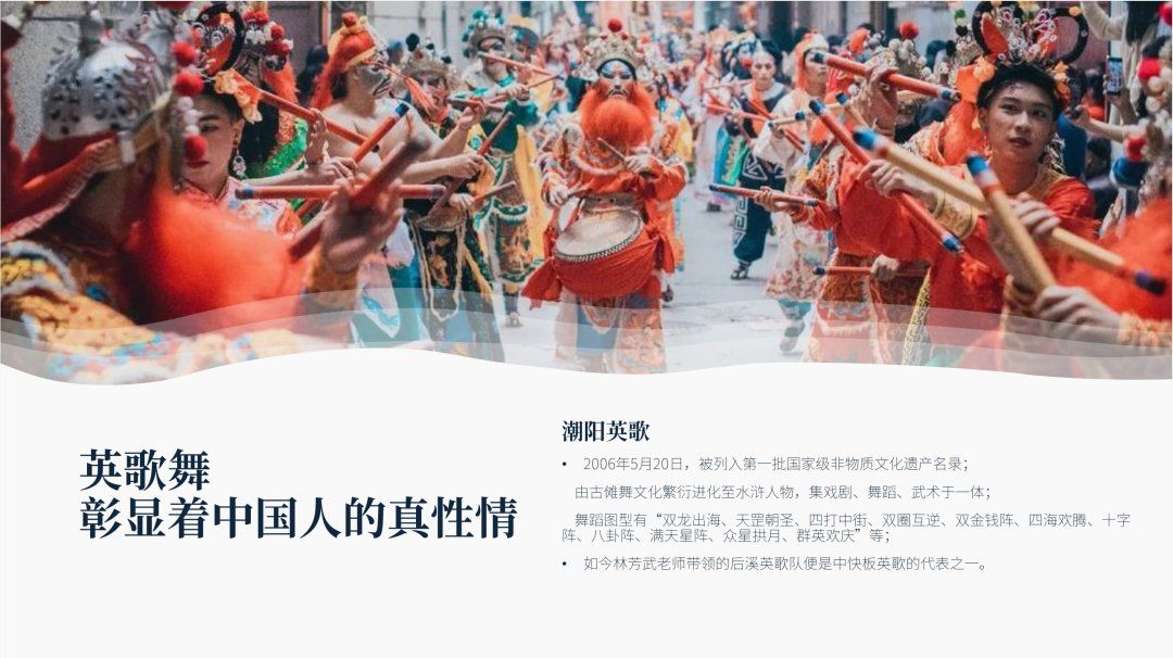 由古代傩舞进化而来,是潮汕地区广泛流行,集戏剧、舞蹈、武术于一体的民间艺术。它扬正压邪,在全国乃至世界的范围内,找不到另一种舞蹈语言像英歌舞这样充满豪迈、刚健、激奋。