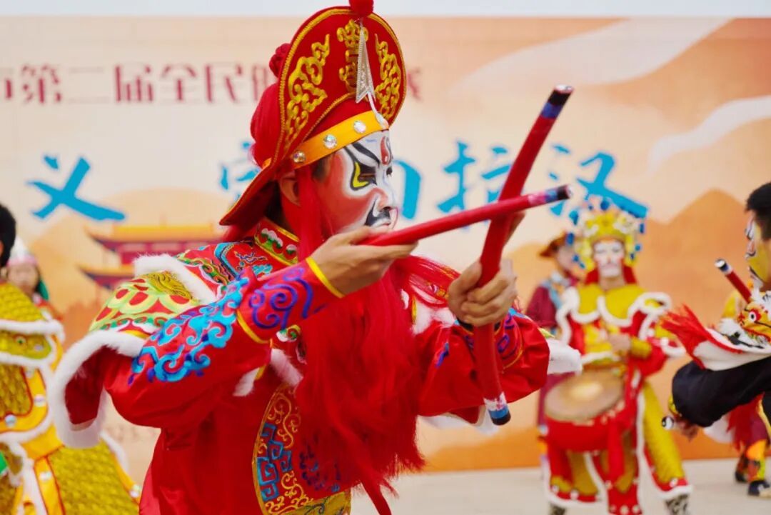 几十位彩绘脸谱、身着威武服饰的彪汉,且行且舞。舞者手执彩色木棒,双脚成骑马蹲裆步,提腿向横跃动,配合锣鼓点、海螺号和吆喝声,两棒相击翻转,忽而腾龙、忽而伏虎、腾挪闪跃、气势纵横,还不时发出激越、豪雄的怒吼,汇合着双槌清脆的击打声,响彻云霄。