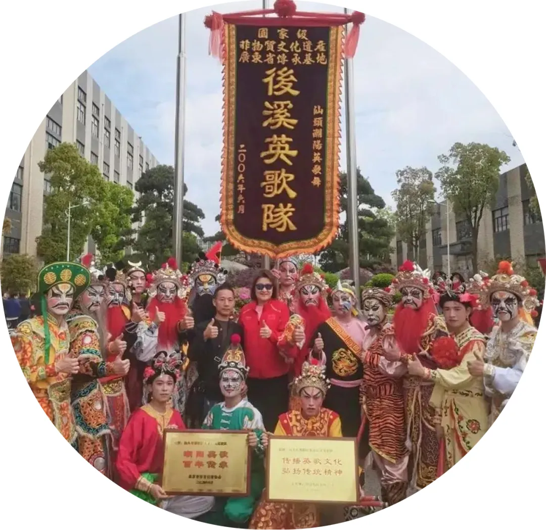 后溪英歌队拥有国家、省级、市级、区级各级英歌传承人。2012年,潮阳后溪英歌队训练基地被省文化厅授予“广东省非物质文化遗产传承基地”。后溪英歌是潮阳中快板英歌的代表之一。以武术刚柔并济之根铸乡土气息之舞,舞步稳健豪放,刚劲有力,旋转自如,富有阳刚之美。鼓点慢、中、快节奏分明灵捷、变调有序。舞蹈图型有“双龙出海、天罡朝圣、四打中街、双圈互逆、双金钱阵、四海欢腾、十字阵、八卦阵、满天星阵、众星拱月、群英欢庆”等。
