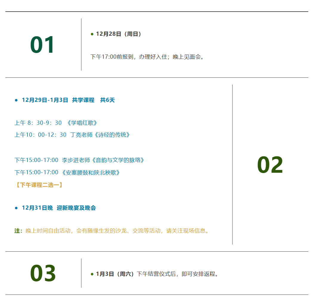 – 上午选修课有(1)《学唱红歌》(每日上午8:30-9:30);(2)丁亮老师《诗经的传统》(每日上午10 :00-12:30)。