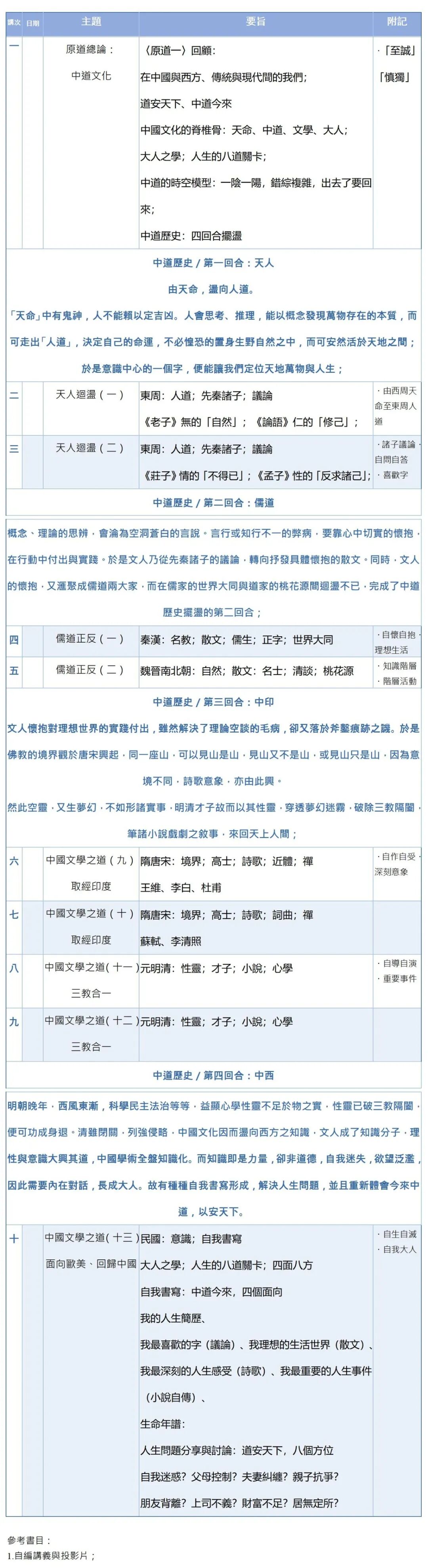 (附注:此课内容包含中国历代文学经典导读与自我书写,修习过的同学若欲报名,当考虑内容重迭问题。)