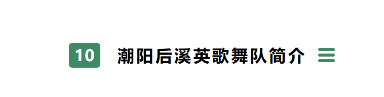 后溪英歌队拥有国家、省级、市级、区级各级英歌传承人。2012年,潮阳后溪英歌队训练基地被省文化厅授予“广东省非物质文化遗产传承基地”。后溪英歌是潮阳中快板英歌的代表之一。以武术刚柔并济之根铸乡土气息之舞,舞步稳健豪放,刚劲有力,旋转自如,富有阳刚之美。鼓点慢、中、快节奏分明灵捷、变调有序。舞蹈图型有“双龙出海、天罡朝圣、四打中街、双圈互逆、双金钱阵、四海欢腾、十字阵、八卦阵、满天星阵、众星拱月、群英欢庆”等。