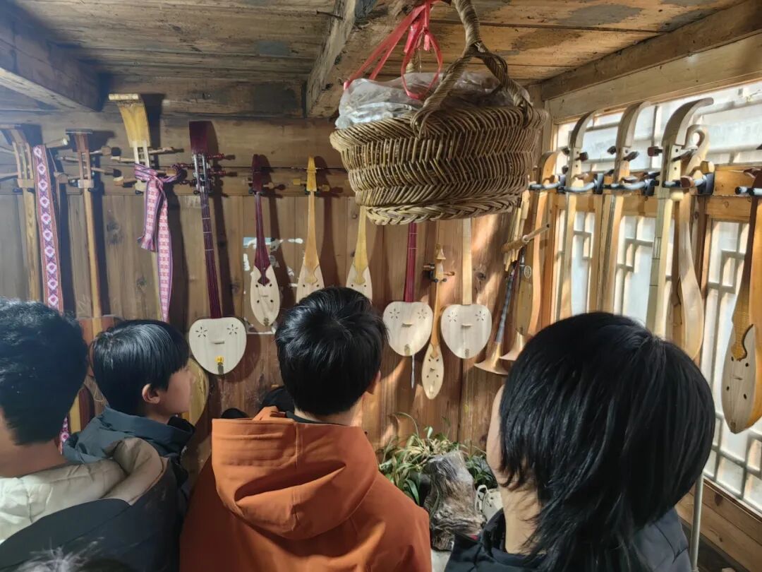 下午先去看侗族的乐器,进到老师家,大琵琶、中琵琶、小琵琶、牛腿琴等挂满一屋,琳琅满目。这儿的琵琶是要拿着一个弧形的片片,去拨弦的。有四根弦的,也有三根弦的,不同大小的琵琶还分为好多种。和南琵大有不同,与北琵相比更是天差地别了。