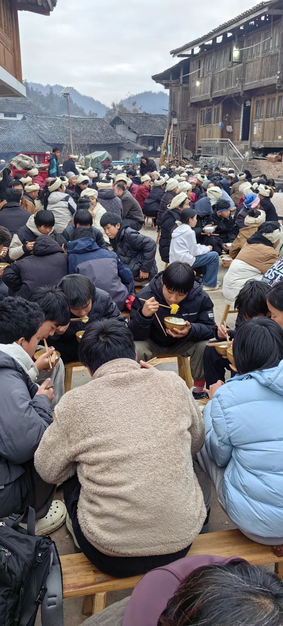 这边的丧事好特别,办“喜丧”。有人去世,大家一起帮忙,一起搞活动。今天晚饭我们参与进去一起吃饭,开饭前有放鞭炮的,满地都是放鞭炮留下的碎屑;有吹芦笙的,男同志们里外围成几个圈,外圈是手拿着的,里圈是杵在地上的,不同大小的竹子做成的笙,有种西洋乐的感觉,奏乐时还有左右转身摇摆的动作。吃饭时桌上的菜不够还可以去旁边打,也会有人很照顾地来问你:吃没吃饱啊?用不用加啊?我们吃完把碗筷放一起,旁边阿姨连忙说不用收拾。