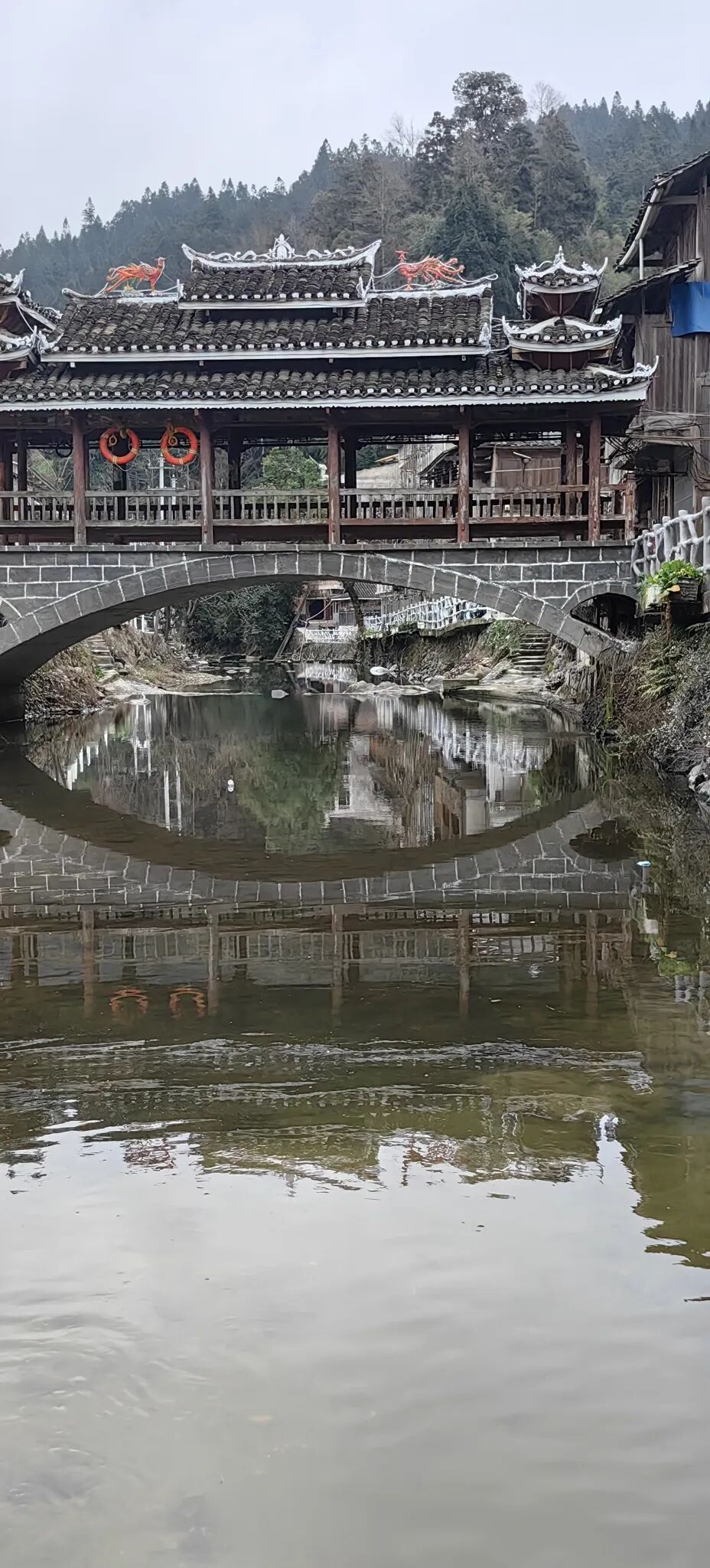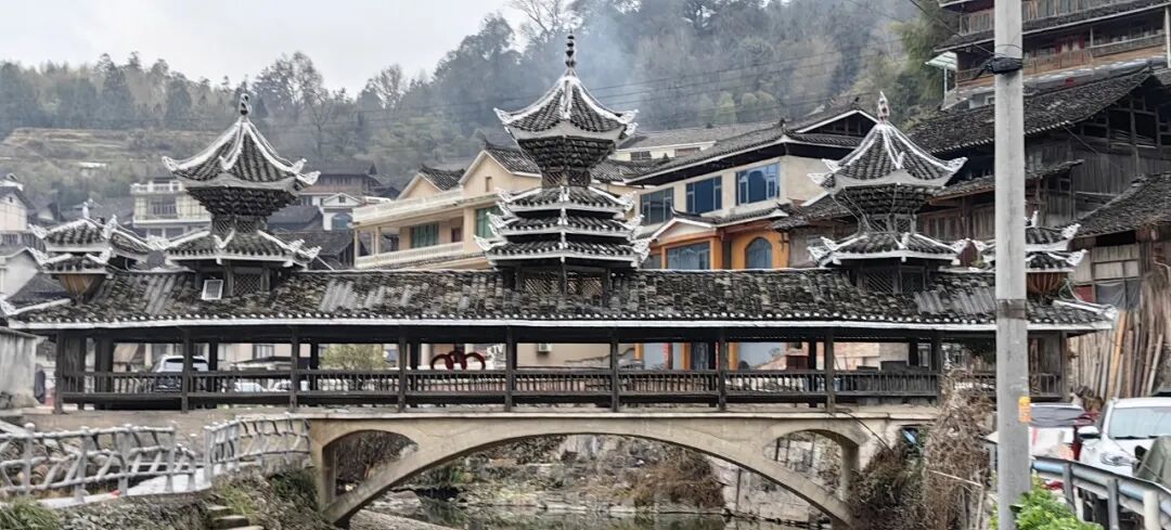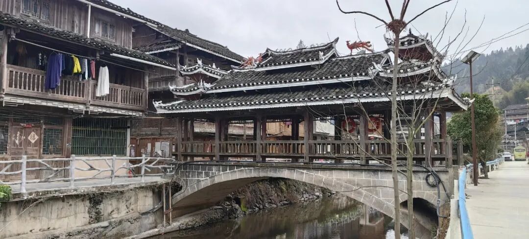 侗寨很有代表性的拱桥因式样美观而被称作“花桥”,可以遮风挡雨,还有座位可供人静坐饱览桥外美景。在地扪,这种桥共有五座,供当地人过河之用。每座桥的细节又各不相同,博物馆跟前的这座桥,名叫“向阳桥”。