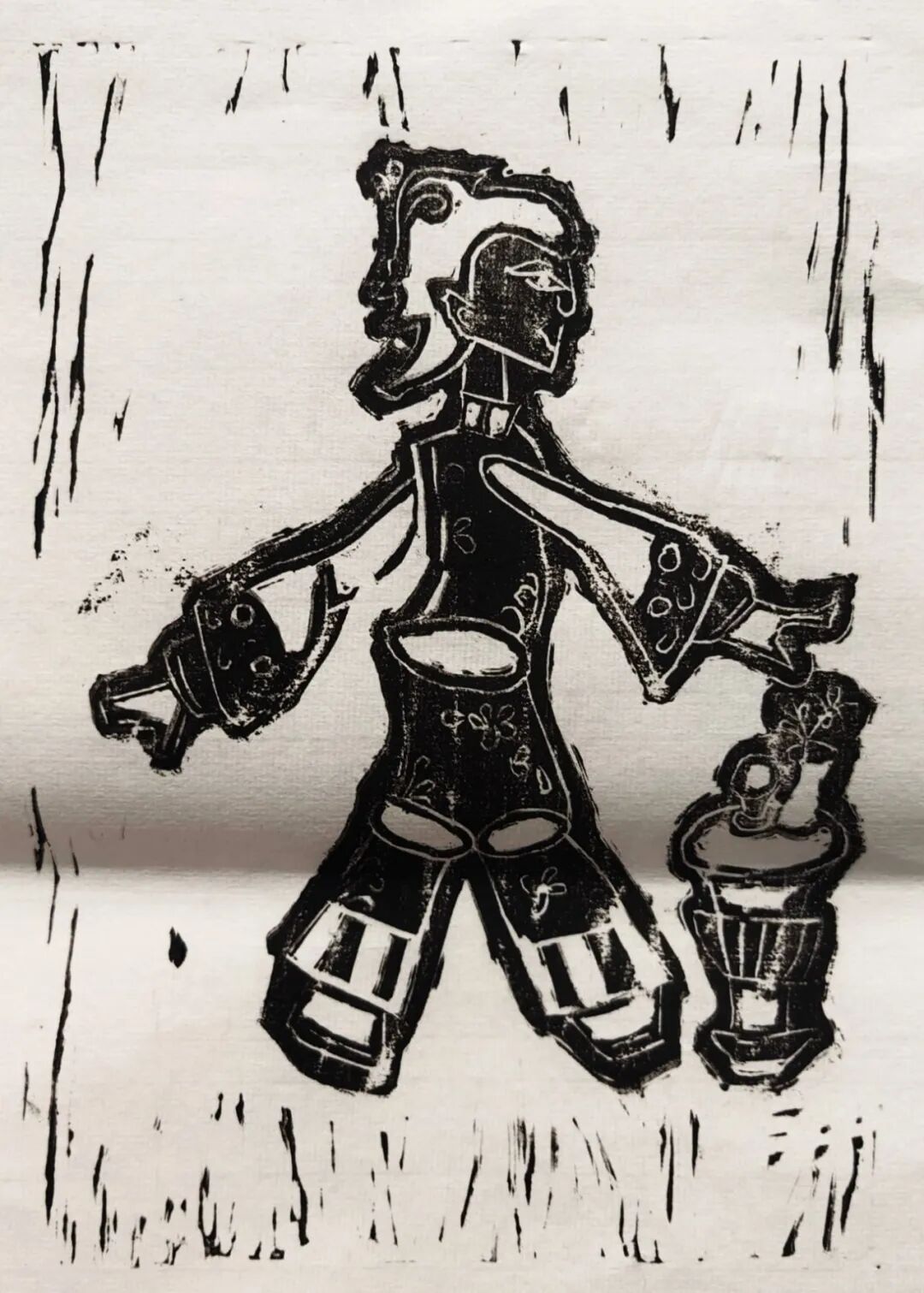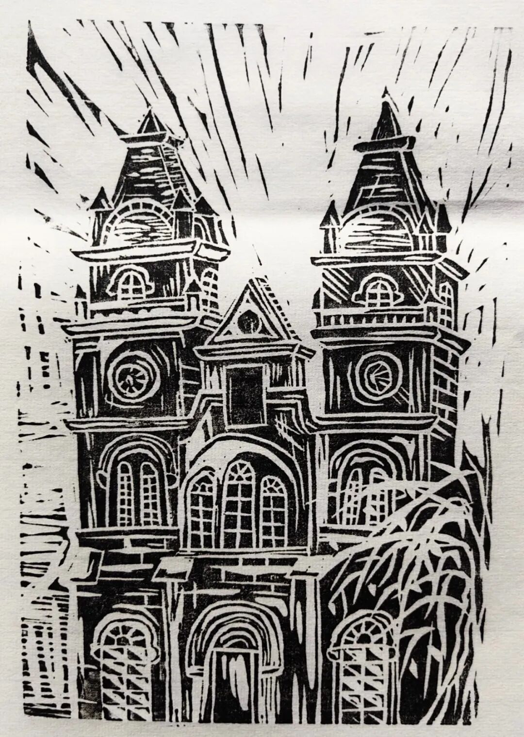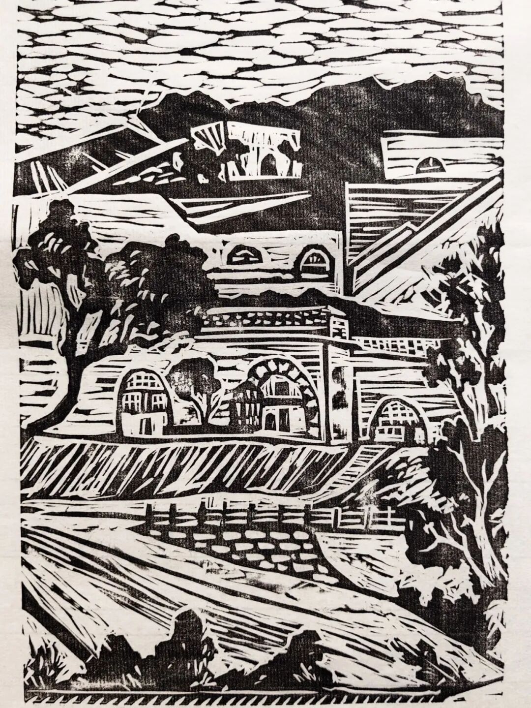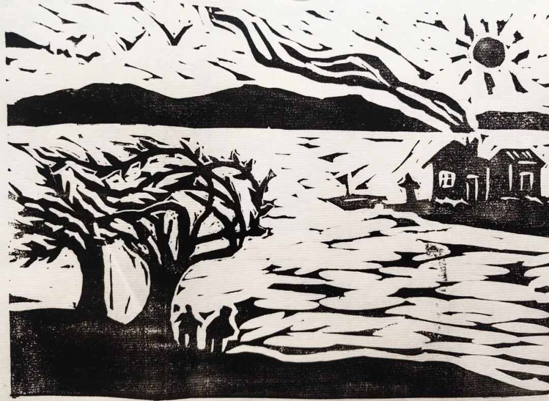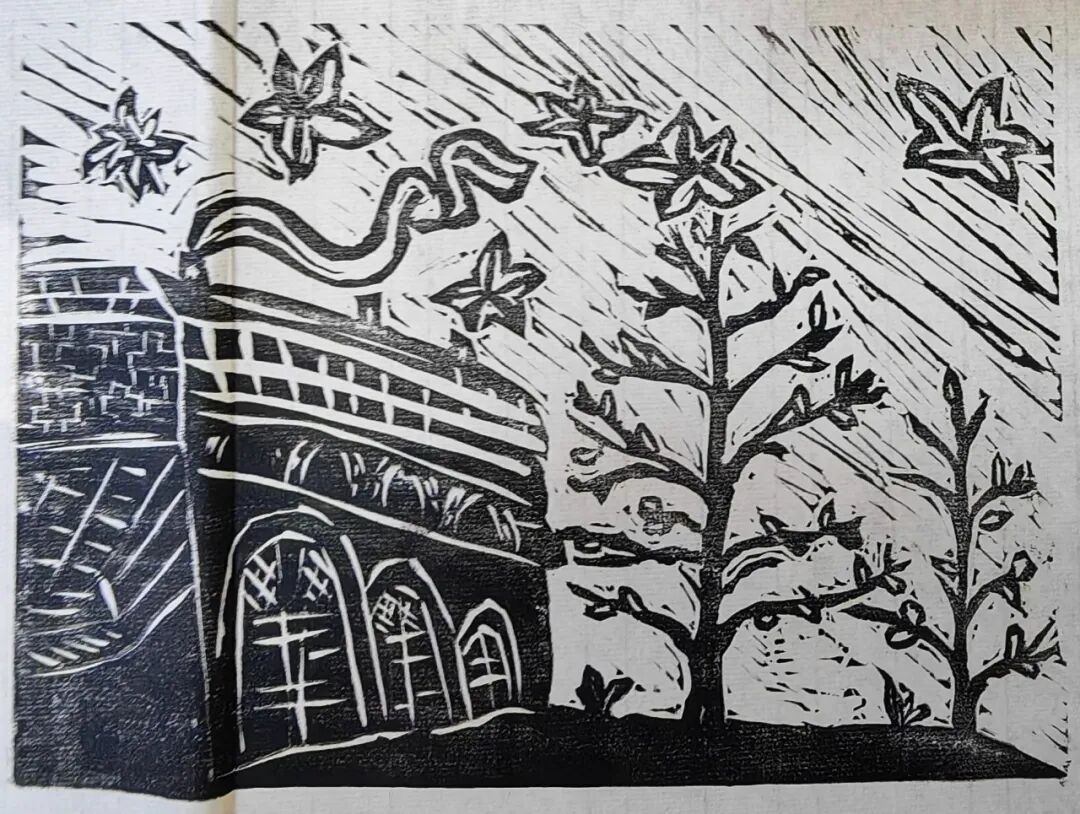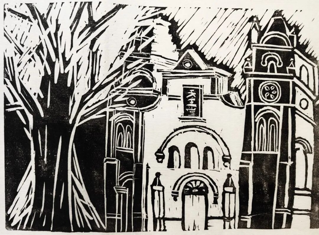 今天上午的版画课非常有意思,老师带来了油墨,我们可以把前几日刻好的版子印下了。我的版子被老师印下来,刻的是鲁艺教堂。在左下角还有一棵小小的杨树。后来就有好多同学想要一张。到最后都有些印不过来了。期间在教室里看到同学的作品,好像再简单的线条在经过油墨的洗刷后都变得特别庄重、高贵。也是我喜欢版画的原因之一,画中的线不管怎样都是有力、有神的,黑白关系也很美,与西方油画是两样的。