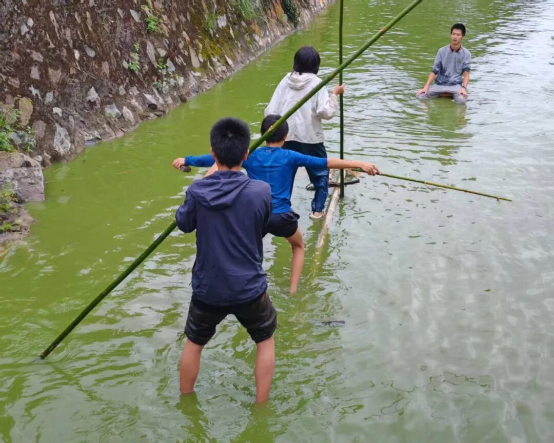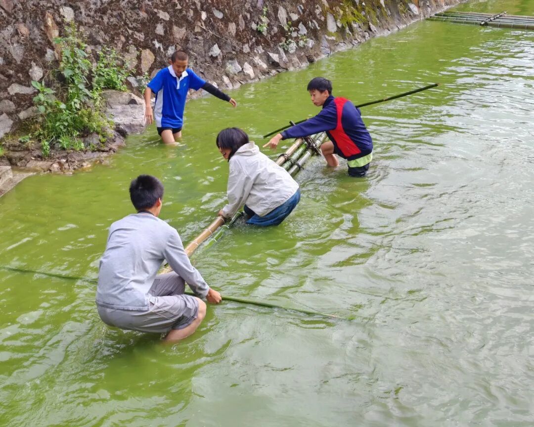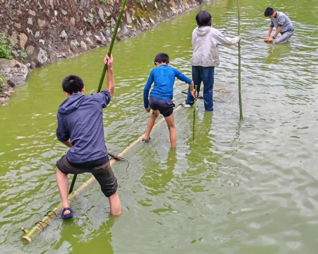 来到山中,亦要“寻找中国帆”,不过山中可没有帆,只有竹子,在熟悉安居之后,贝壳老师便领着我们上山砍竹子、造竹筏,为了冬季回东山岛后造舟打好基础,我也因此得了个“六刀”的绰号(指我用六刀砍断一根竹子)。之所以选用竹子,是因为福船的水密隔舱构造,来源就是竹子,即使某一节破裂,其余完好的竹节依旧可以使其漂浮在水面上。刚好是入冬时节,竹子中的水分与糖分随着冷气而减少,使其变得更加有韧劲。贝壳老师没有让我们使用电动工具、绳索等现代工具与材料,而是我们自己于山间采伐藤条、削制竹绳,而后将截成等长的竹子排好,用这些最原始的材料来捆绑、固定。最终,在基地门口的池塘,我们将扎好的竹排从池塘边约三米的高处抛下,见其安然无恙地在涟漪中沉浮,才算大功告成。将近五米的船,宽约一米,承载三个人而不沉,我们也玩得不亦乐乎。