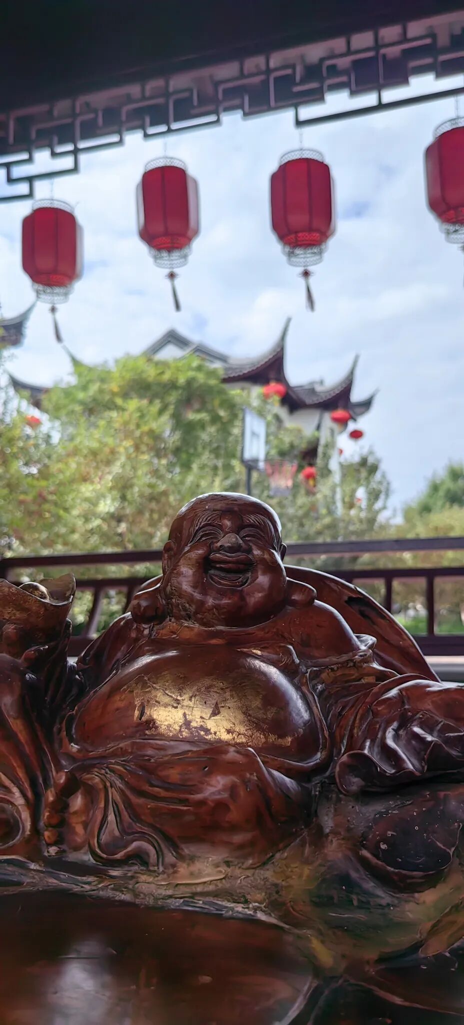 玉泽园回廊正中的茶海是从北京运来的,是最早我们在小汤山讲礼村办共生小书院时,房东家的。当时,我们就把这个四五百斤的大家伙当作季节桌,而茶海上的木雕弥勒菩萨总是笑眯眯地看着我们。房东张教授、吕奶奶后来陆续离世了,吕大哥将茶海送到顺义,如今弥勒菩萨又陪着我们来到冀州,也将护持大家行走天涯。