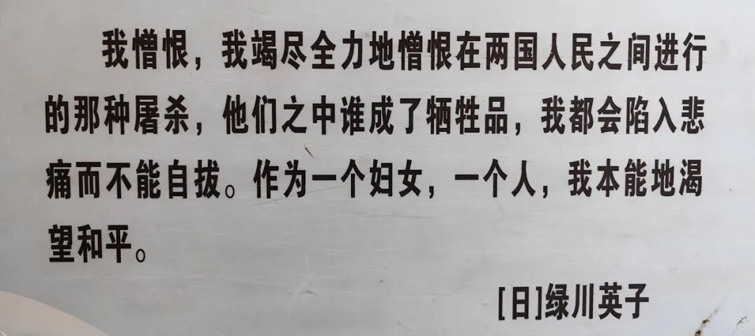 在那中日战争年代,有几百名日本青年认识到侵略的罪恶,为了早日结束战争和中国友人携手前进。其中有不少人曾在反战活动中牺牲。我希望我们年轻一代以此引为自豪。同时,正因为有了这种流血牺牲,今天才开放出光辉夺目的日中友好之花。