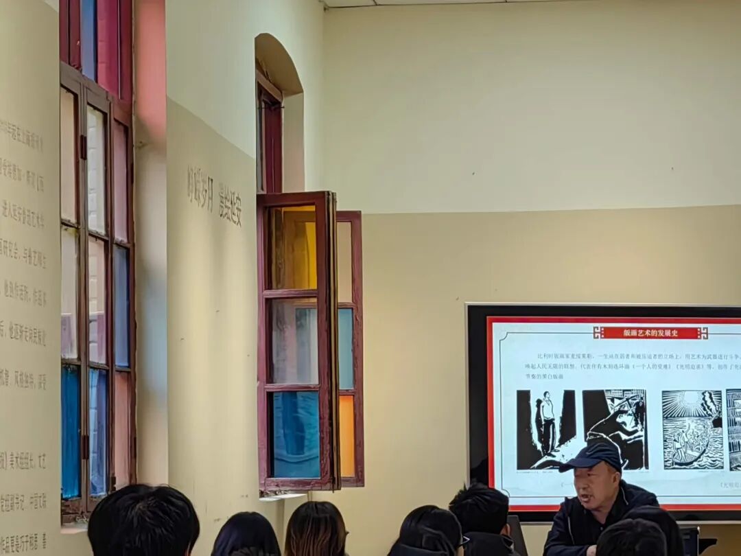 中途来了几个游客,身边的导游讲述着这座教堂的历史,曾经的那么多出名的文艺作品都在这个舞台上表演过,突然一下子觉得先辈们离我们这么近,甚至就在我的面前——台上一个又一个活灵活现的表演。在我站着的位置,身穿打补丁的军衣,却个个精神,时不时拍手叫好。如此鲜活,这就是延安时期,真正将文艺融于生活,走在路上哼着小曲,街边随意的一个小花小草小树小房子都能成为板画的主题。抱着作品穿梭在各个课堂,都是为了抗日,保家卫国,都是“同志”啊!