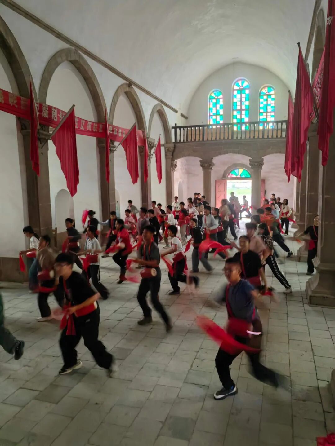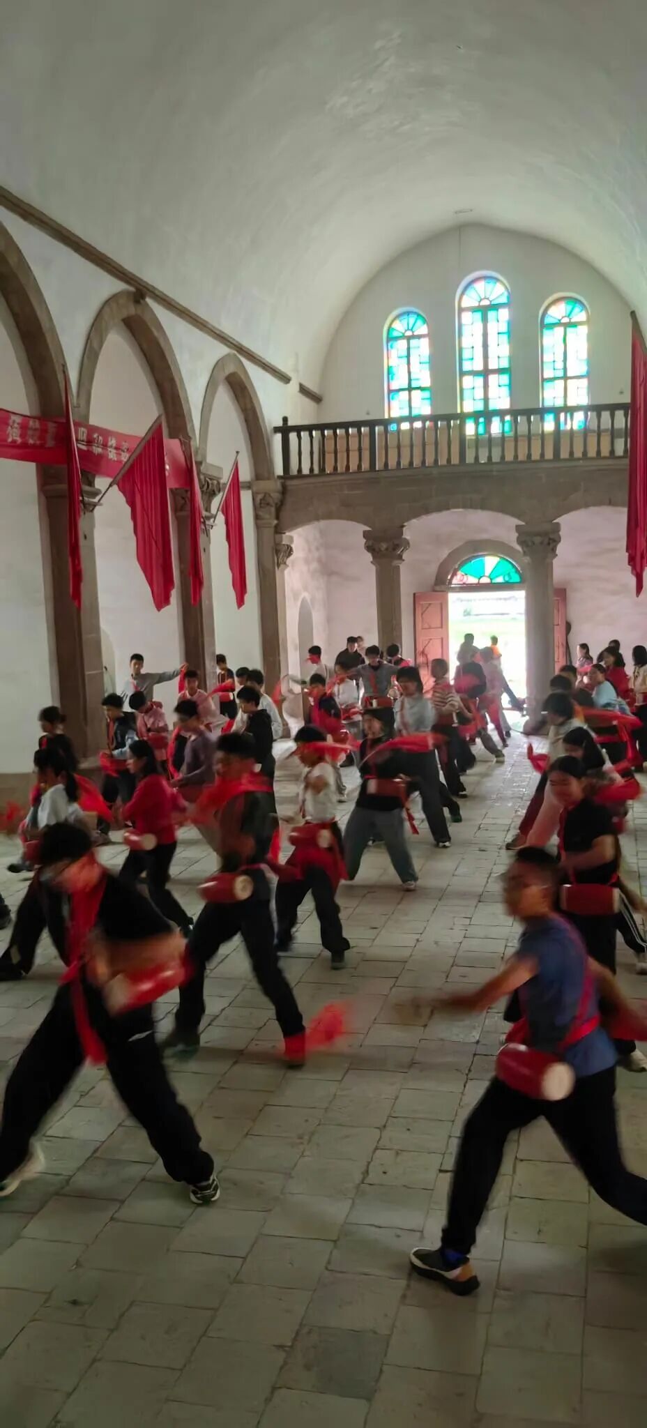 下午学习安塞腰鼓。在教堂里排成一个方阵,腰鼓又红又小,一对鼓槌的“尾巴”上还绑着红绸带。本来还觉得腰鼓没有多累,至少没有打英歌时累,可等下了课