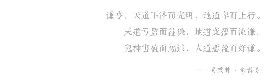谦者,兼也,因为这个世界有太多苦难、艰辛、委屈、失望,所以才要兼收人道之好、鬼神之福。王者不是故作谦虚状,而是虚己游世,故能“好好恋爱”【关雎】、“好好喝酒”【鹿鸣】、“好好创业”【文王】、“好好去死”【清庙】。而“夫妇”、“燕享”、“缉熙”、“祭祀”这几个词,都非常不简单,因为今人缺乏对天意的厚度、对文字的厚度的了解,故无法体会其正大、美满。