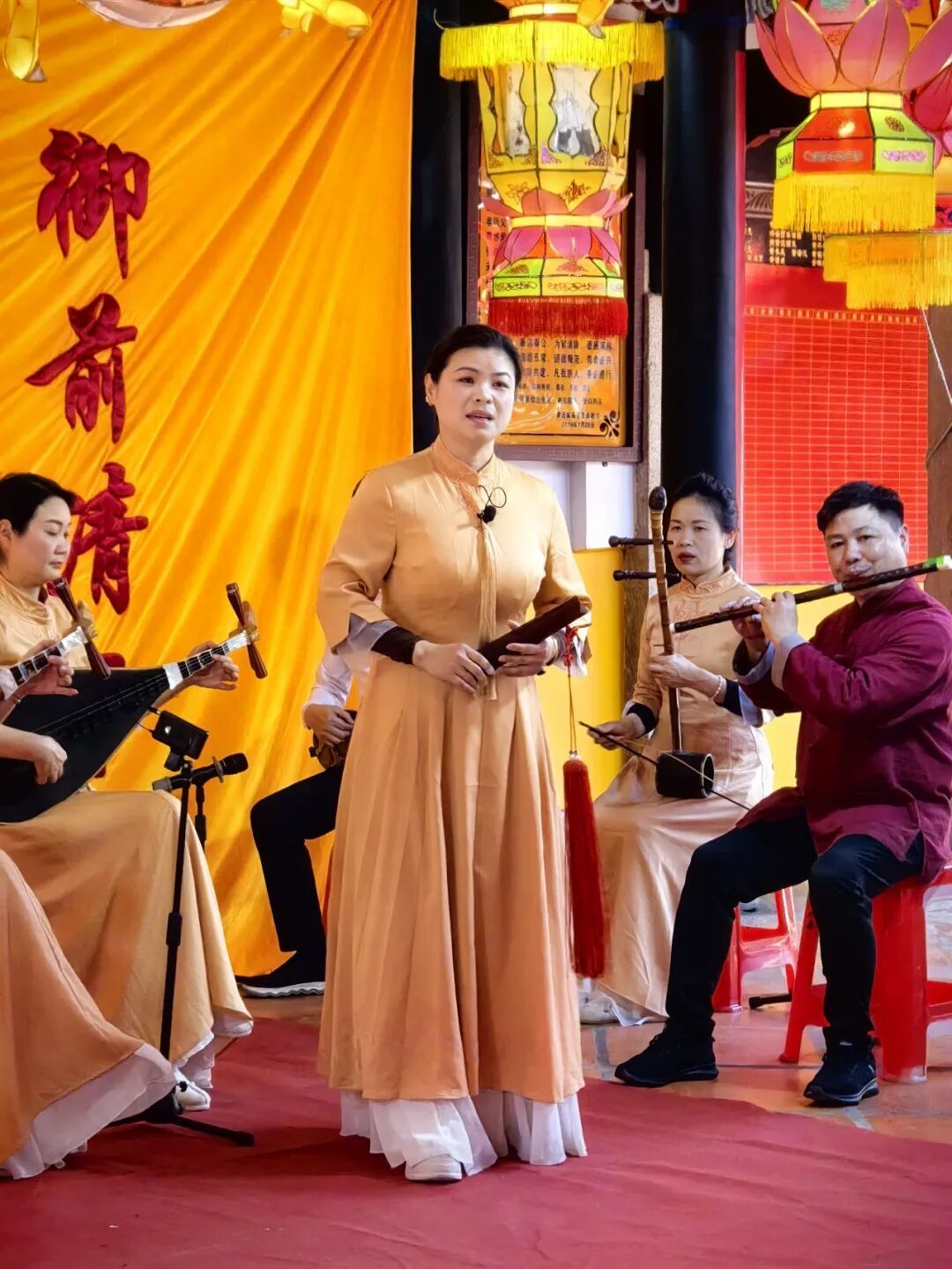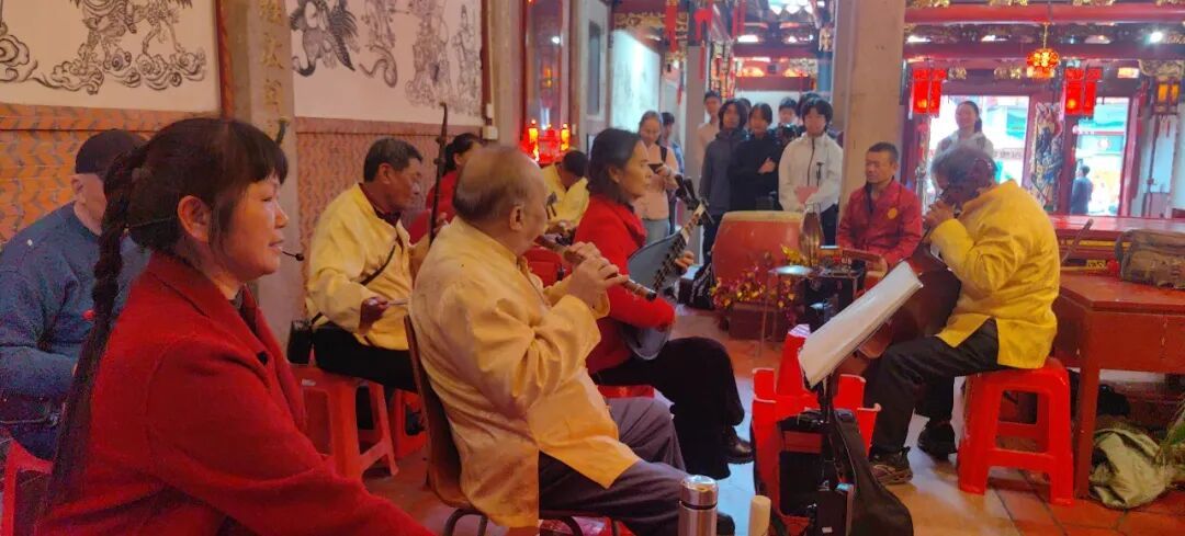 去往今日采访的乐社途中,我们也边进到各氏祖祠中,看了不同乐队在元宵时的演奏,虽然弹奏的曲目各不相同,但都能听出来大家的专注与深情,认真极了,心中慢慢也更受滋养与鼓舞。再看傅老师有声有色演唱《三千两金》时,忽地就对上午采访的各位老师所说的:“南音社的举办,正是‘玩’起来才有的”这句话有了更深的体会。在采访中被每位老师学习做人与对待南音的真诚所激励。不止学南音是这样,做人做事也一样,先从真心诚意、真诚与坚定地去做人开始。
