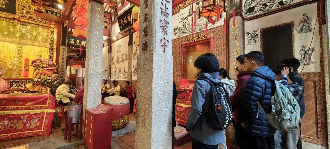 在为采访李建瑜老师做准备前,我们还有一些时间,便走进丰州的巷子里采风。恰逢慈济宫落成典礼,里面有老师傅在演奏。我目前还只能分辨出他们使用的是南音乐器,具体是什么曲子不太懂。但看到孩子们和老师傅们相遇的那一刻,我特别兴奋,有一种学过的东西终于用上的欣喜。老师傅们看到我们这群孩子也很好奇,我们说明是前来游学的,孩子们也学过一些南音曲目,便被热情邀请一同演奏。这个过程让我十分感动。我们在拍摄师傅们演奏,师傅们停下来时,也会回过头拍下孩子们,眼神里满是慈爱。直到我们要赶往下一个地点,他们仍再次邀请:再合奏一首吧,孩子们会不会?孩子们总会遇到这样温暖的场景吧,毕竟,他们是这个社会的新希望。