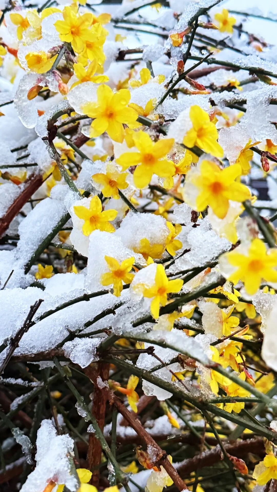 唯一艳亮的是,迎春花开了,躺在雪中,像一个一个初生的小太阳,元气满满。站在二楼望出去,才发现,湖边的柳树抽芽了,飘扬在湖面上,挡不住的春势啊!