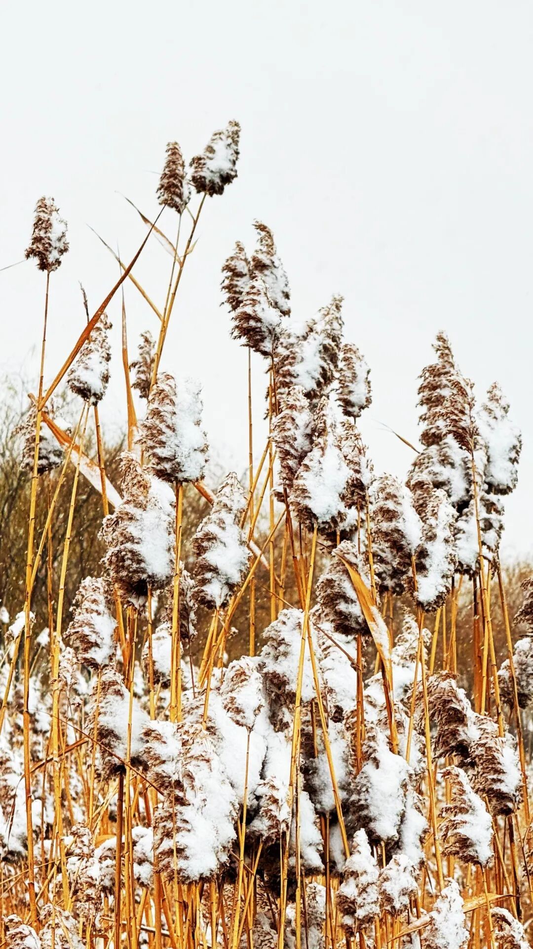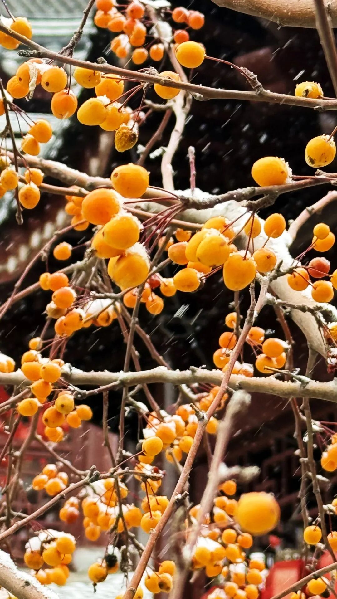 晨练时还感觉冷风飕飕,到中午,太阳出来,照在雪上亮晶晶的。树枝上落着雪,落在红果上,很美。