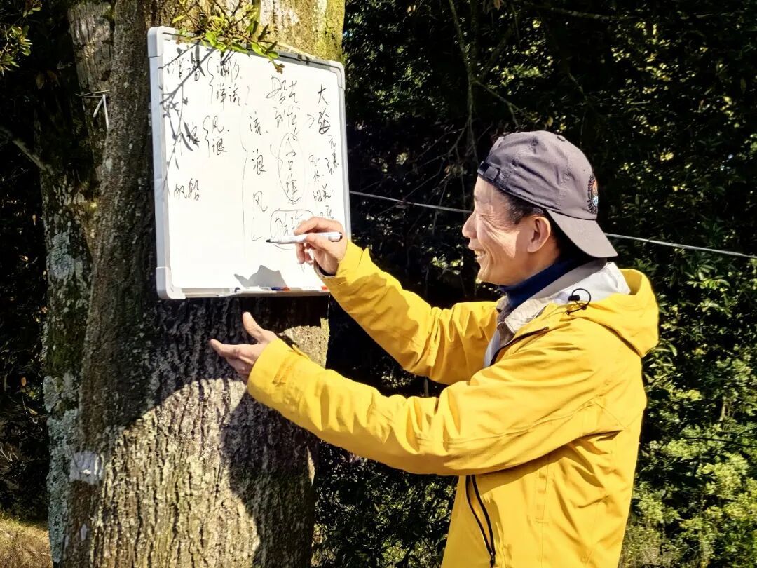 下午上到永春金晖贝壳老师的山上农庄,跟着中国帆项目同学在大地课堂上开启新的一轮学习。贝壳老师把小白板挂在一棵高大的青棡树树枝上,踩着泥土回顾了与大海的合作,介绍即将开始的菌田农法——归根复命,生生不息。