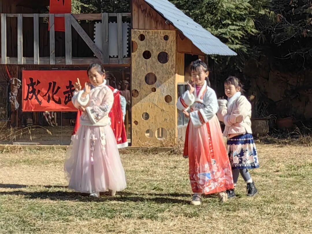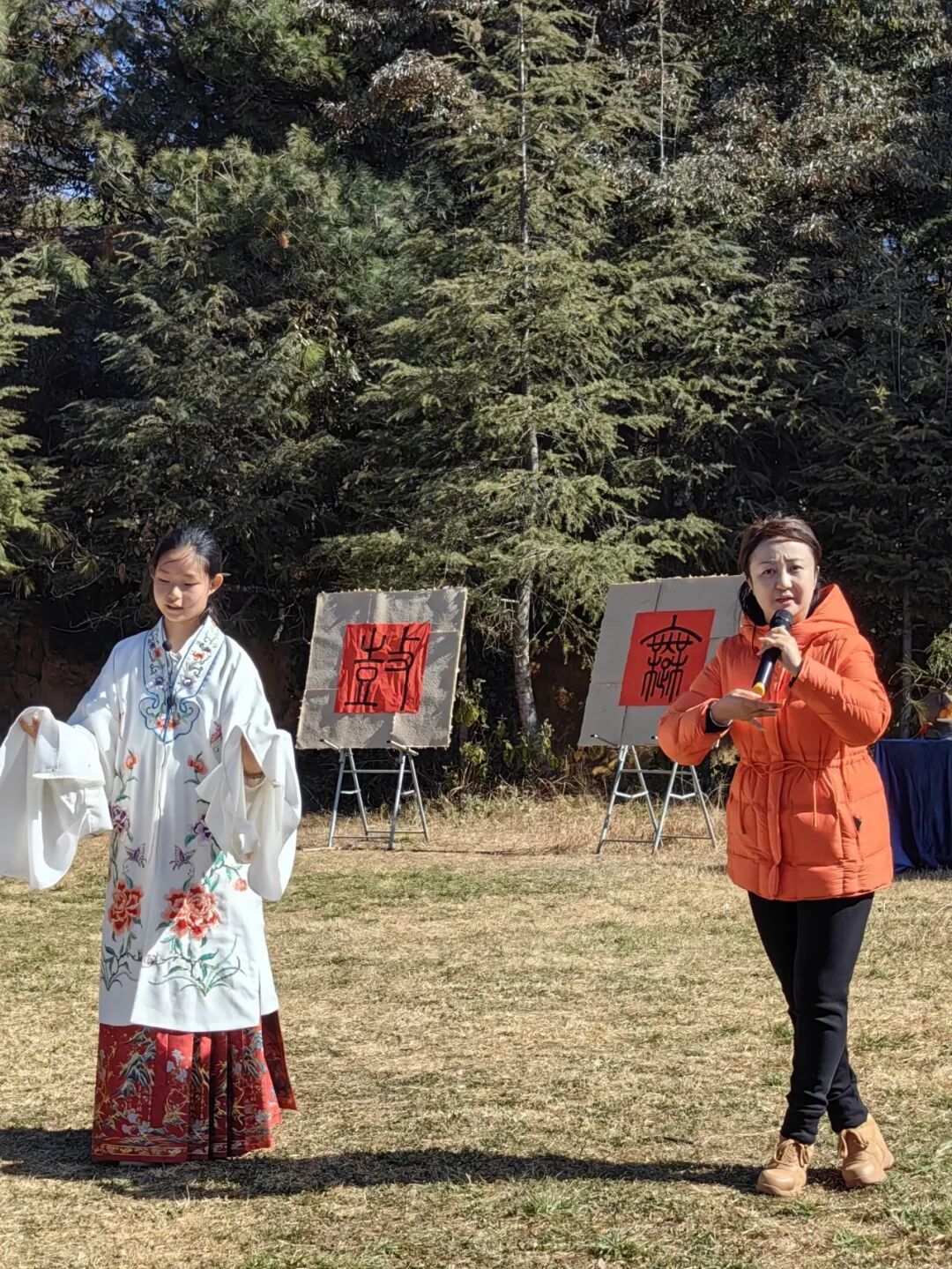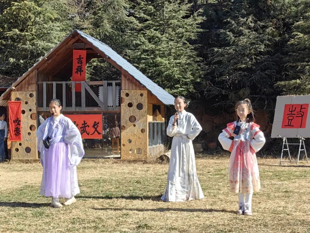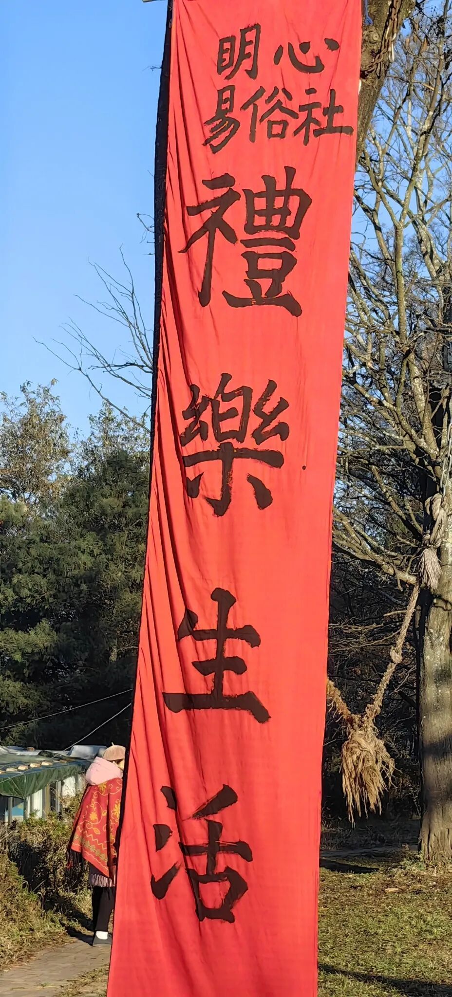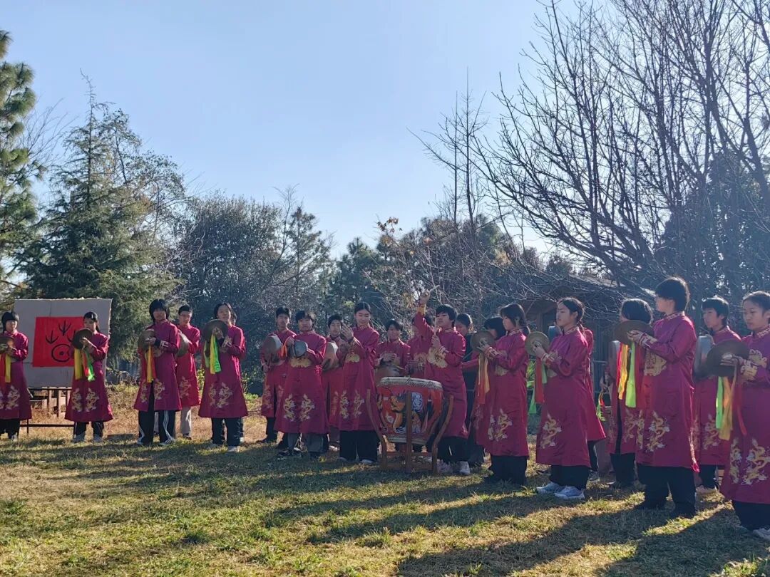 “大美礼乐,念念在春”。腊月初六,明心书院花树环伺的校园,张挂吉祥幡旗,老少师生,乡邻贤友,齐聚草坪,举行春祭大典。供桌上竹梅拱卫“天地圣亲师”之位,春气洋溢,俎豆馨香。吉时到,锣鼓锵锵,天地开张。书院主人焚香敬拜,致敬皇天后土、山川先贤。三酹春酒,酬谢天地圣贤。夸父班奏《圣寿乐》,吹笙鼓簧,德音孔昭。猎猎英歌,驱邪纳吉,侗歌入云,京韵悠长,最后全体齐唱《我和我的祖国》,酬勤报本,神人同庆,春祭礼成。