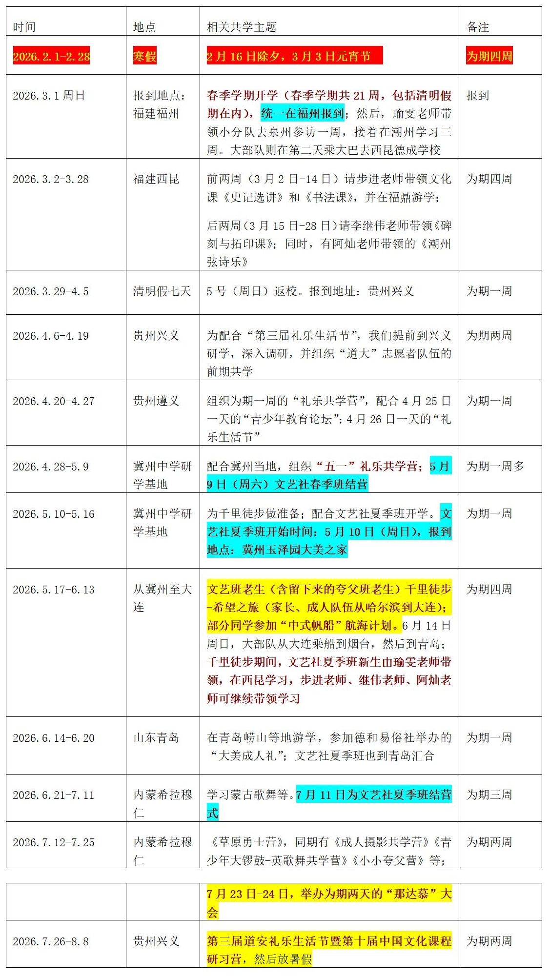 “草原文艺社”2026年将以福建基地为重点,每季度在福建待四周(三次在西昆,一次在东山岛)。其中部分同学将组成小分队,去泉州、潮州、地扪等地深入学习。“夸父班”番号取消,经过了十周考察期的文艺社同学和留下来的前夸父班同学,一律参加千里徒步,或推荐参加同期的“中式帆船”的航海计划。文艺社夏季班同学不参加千里徒步,而是留在西昆基地。