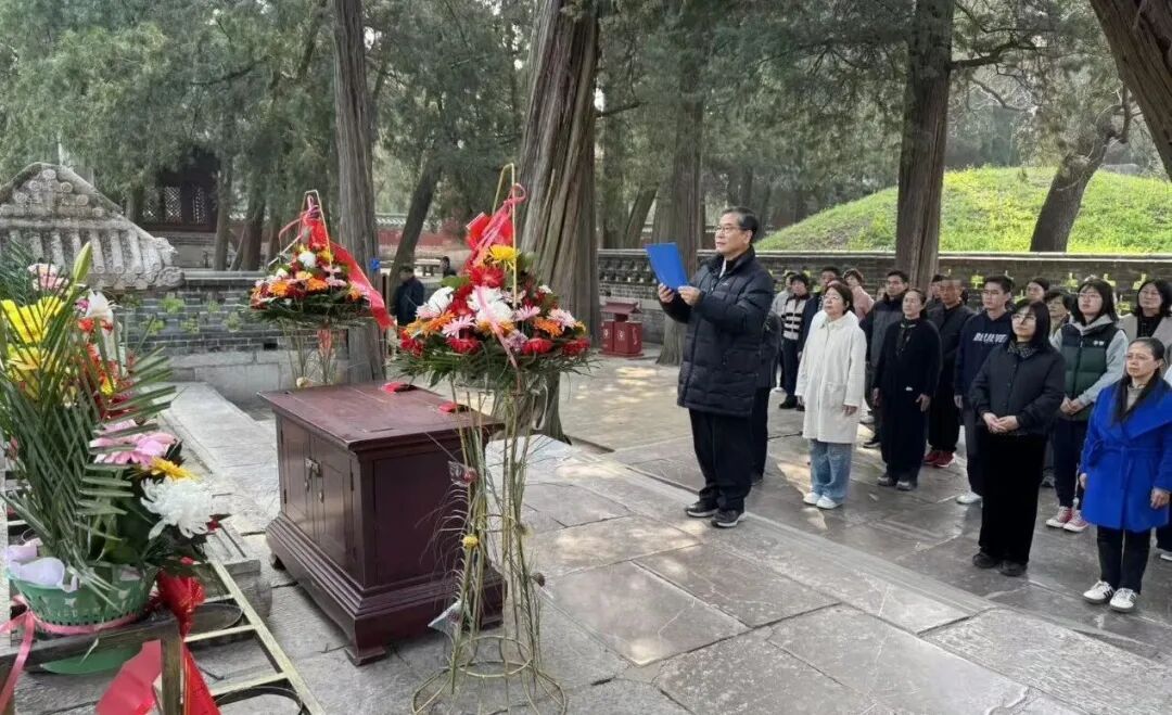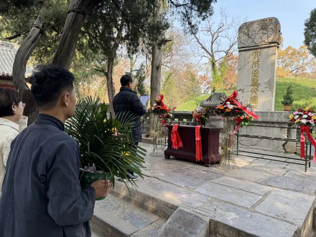 上午在孔林,在孔子墓前,林明进老师主祭,亲拟祭文,敬献花篮。众人齐诵《孔子赞》《礼运大同篇》,又同唱《诗经·维清》。声声入耳,如与先圣同频。