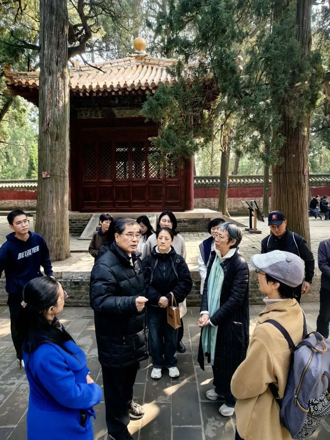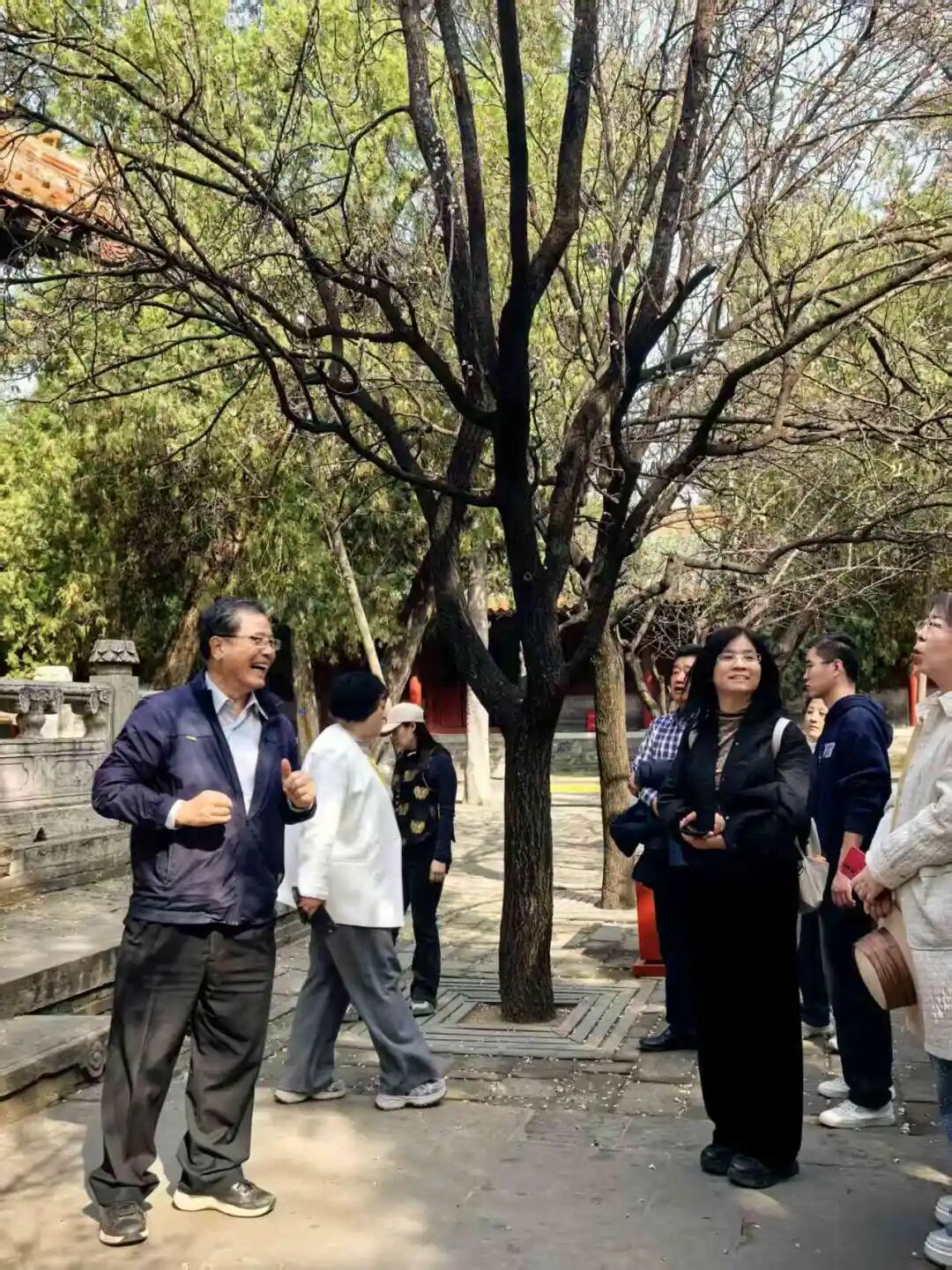 孔林祭孔,庄重肃穆;游孔庙和孔府,轻盈欢快!尤其是行至孔府后花园,春光明媚,惠风和畅,大家围在老师身边,有说有笑。那一刻,活脱脱就是“冠者五六人,童子六七人,浴乎沂,风乎舞雩,咏而归”的画面!